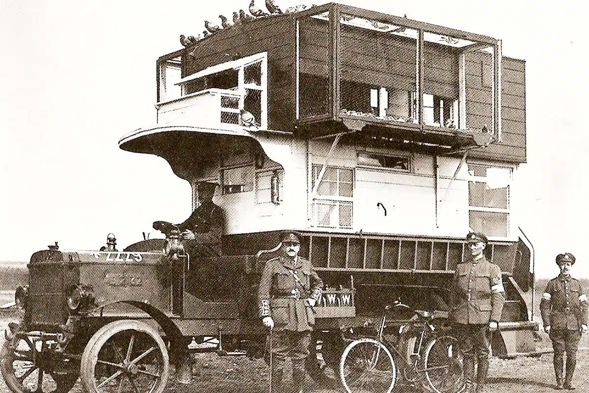 Bild: En buss av B-typ från London byggd om till ett duvloft för användning i norra Frankrike och Belgien under första världskriget, Wikipedia, Public Domain.