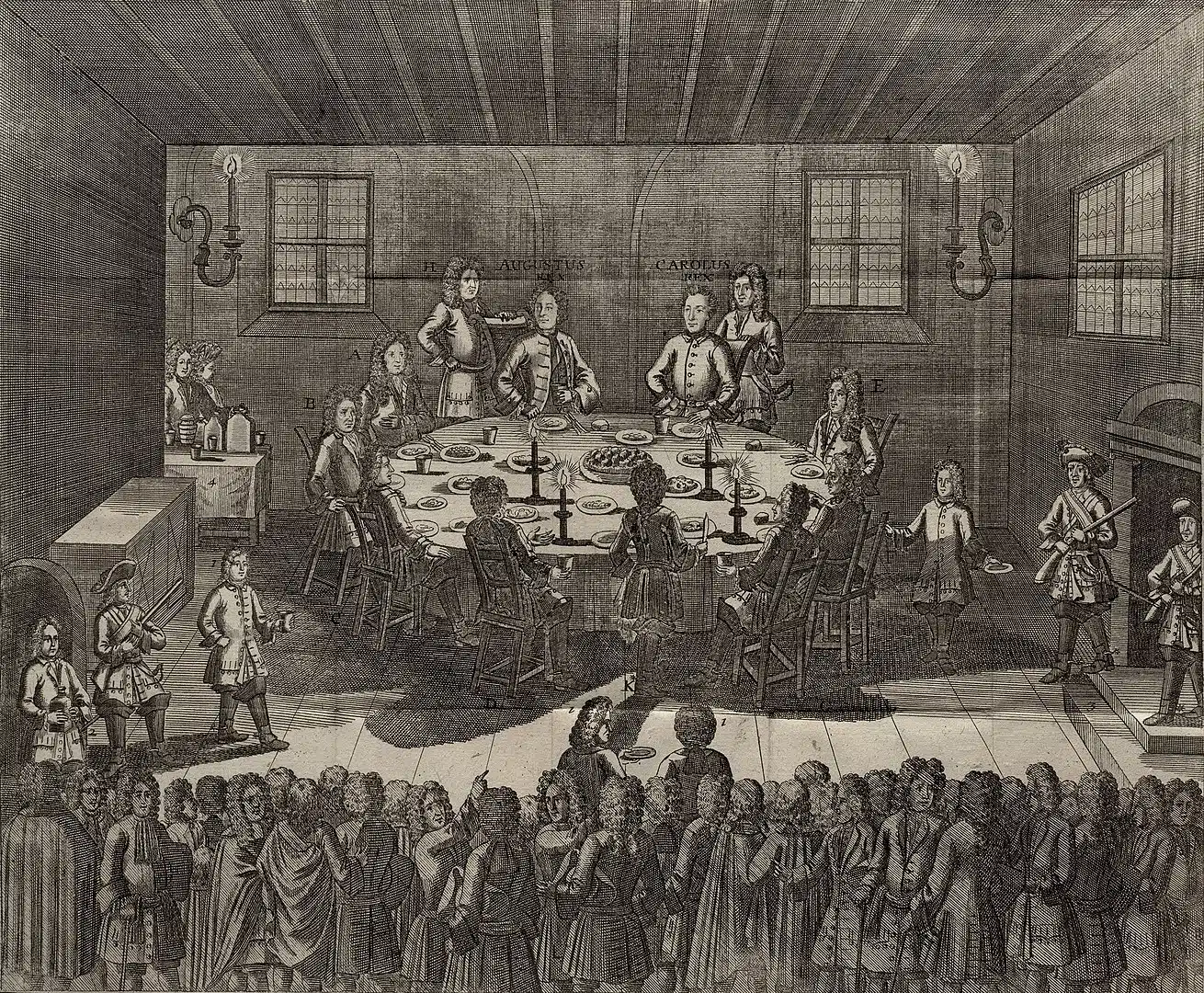 Bild: Samtida kopparstick som avbildar den officiella taffeln med Karl XII och August II efter undertecknandet av freden i Altranstädt, Wikipedia, Public Domain.