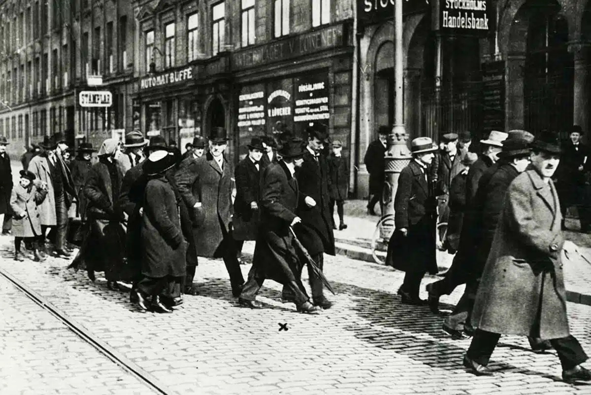 Bild: Lenin (marked ett x) på Vasagatan i Stockholm med Ture Nerman och Carl Lindhagen den 13 April 1917, Stadsmuseet i Stockholm, Fotograf: Axel Malmström (1872-1945), Creative commons.