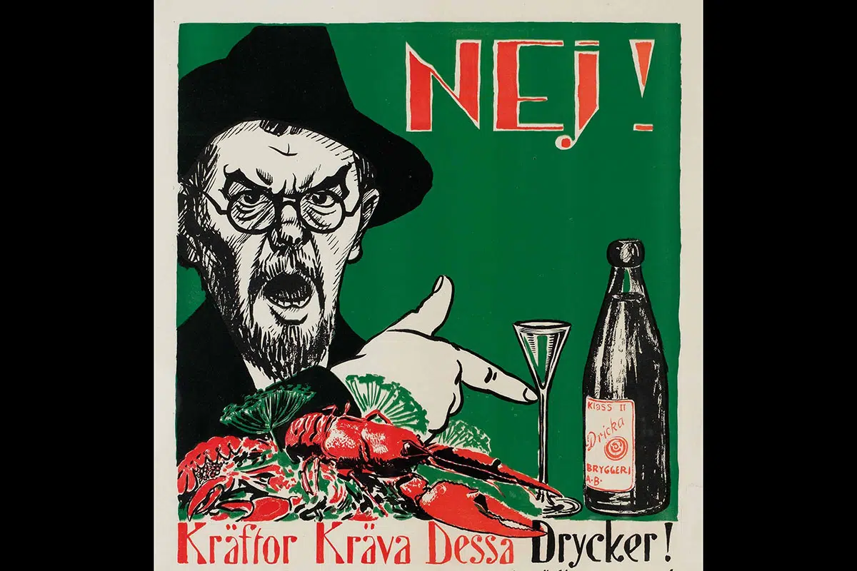 Bild: Kräftor Kräva Dessa Drycker!, nej-sidans mest kända valaffisch i samband med Folkomröstningen om rusdrycksförbud i Sverige 1922 är gjord av Albert Engström. Public Domain.