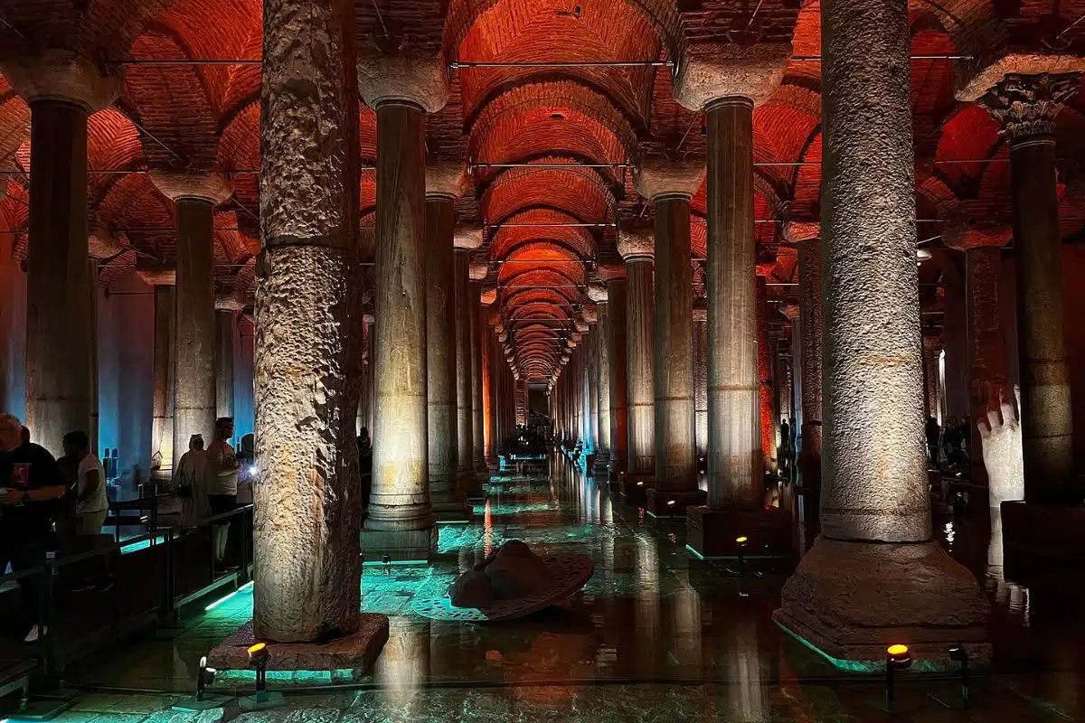 Bild: Yerebatan saray, eller Basilikacisternen, efter restaurering. Fotografi av Kurmanbek (2022). Wikipedia, Public Domain.