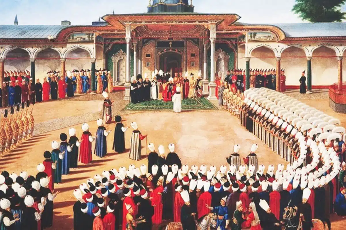 Bild: Sultan Selim III håller en audiens framför Felicityporten. Hovmän är sammansatta i ett strikt protokoll. Olja på duk. Topkapı Sarayı Müzesi, Istanbul (Inv.17/163),Wikipedia, Public Domain