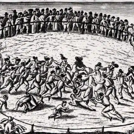Bildtext: ”Il Calcio” – en tidig form av fotboll i Florens. Kopparstick från 1610, ur Itinerario overo nove desctitione de’ viaggi principali d’Italia. Upphovsperson: okänd. Källa: Wikipeda, Public Domain