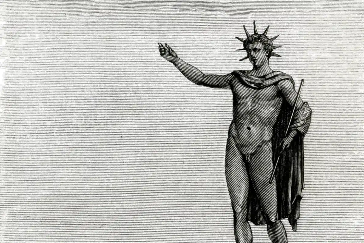 Bild: Kolossen enligt en gravyr från 1800-talet. Wikipedia, Public Domain.