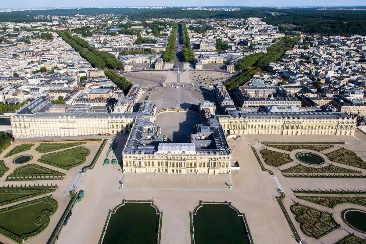 Bild: Flygfoto över slottet i Versailles, Frankrike. Den storslagna barockanläggningen utgör ett av Europas mest kända kungliga residens och symboliserar det franska enväldets prakt under Ludvig XIV:s tid. Källa: Vue aérienne du château de Versailles en France, ToucanWings — Travail personnel, CC BY-SA 3.0.
