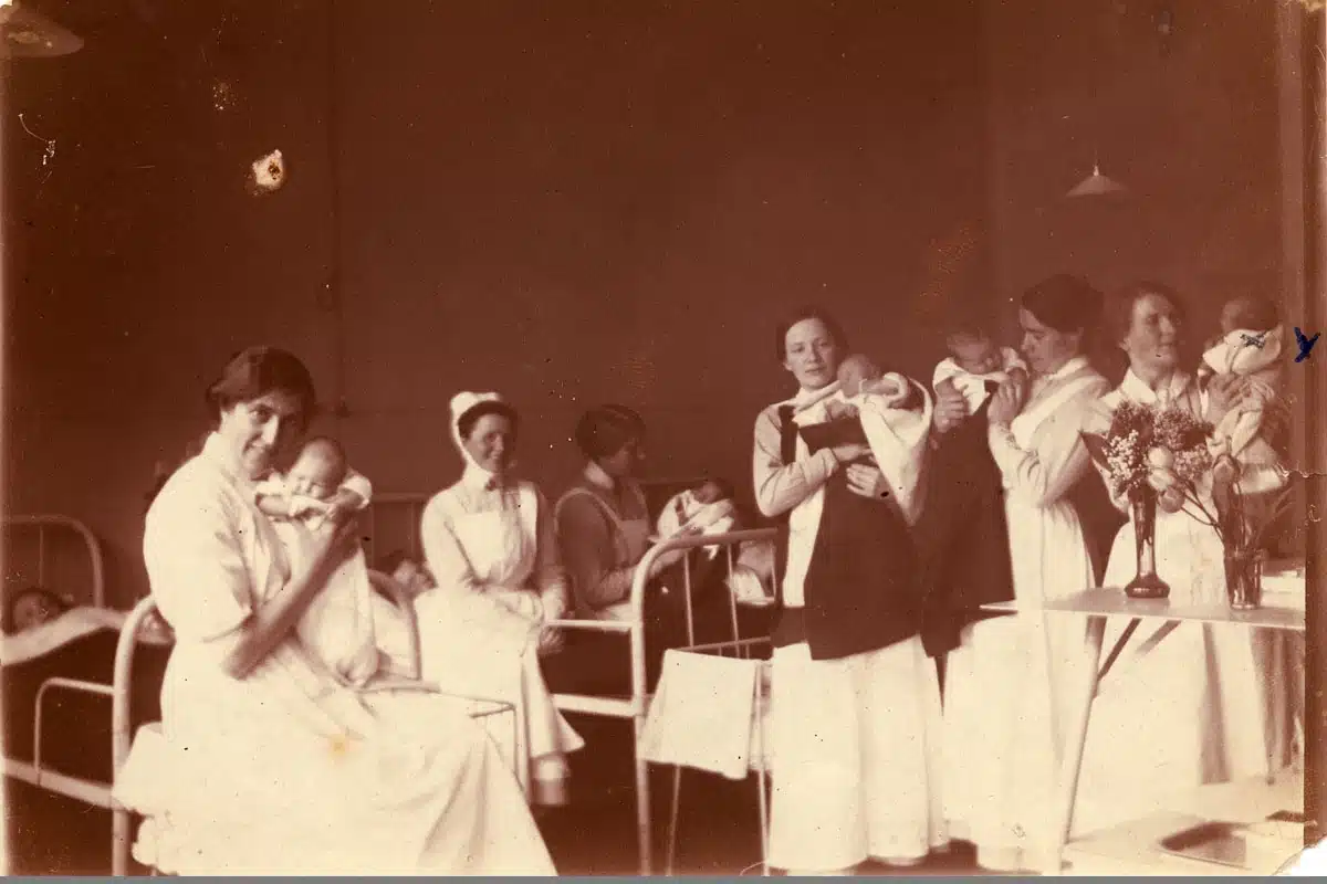 Bild hemsida: Fotografi från BB på Sprängkullsgatan i Göteborg, år 1916. Nyfödda Elna Börjesson (gift Kristoffersson) syns längst till höger. Modern Hilda Börjesson är skymd. Mölndals stadsmuseum, Erkännande-DelaLika (CC BY-SA)