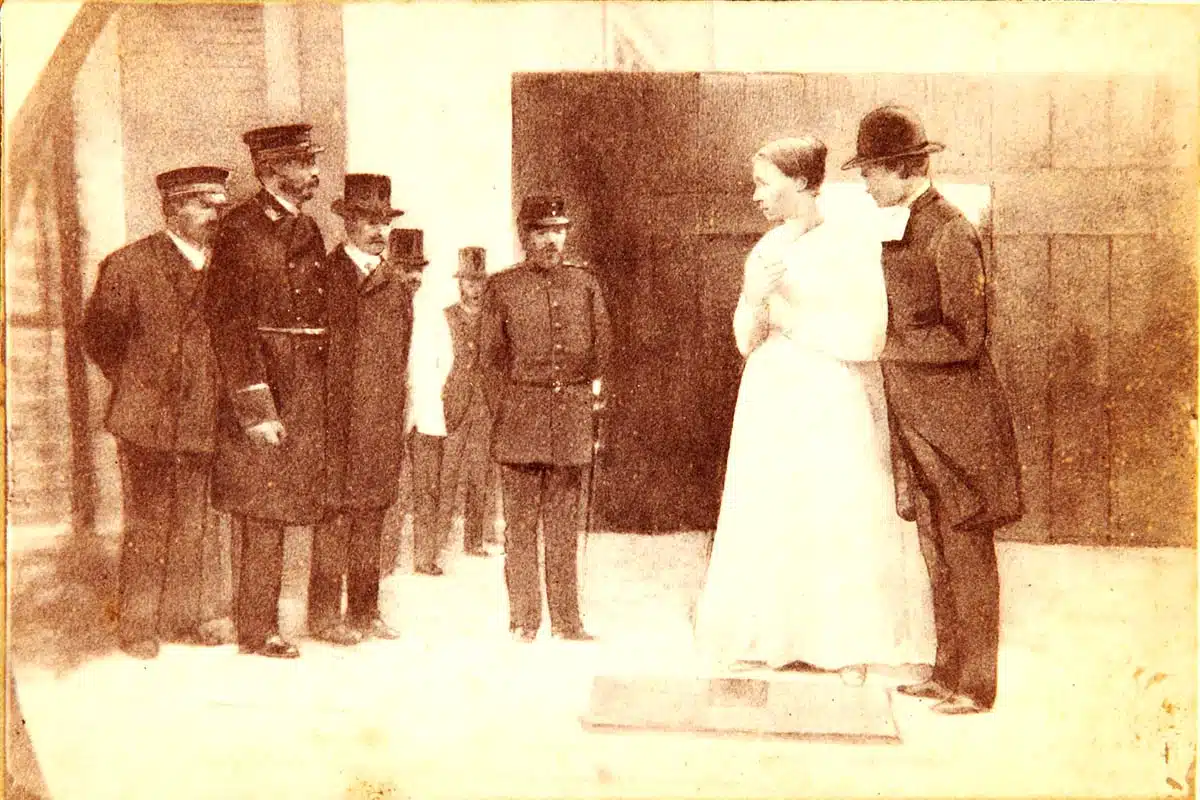 Bild: Anna Månsdotter strax före sin avrättning. Skarprättare Dalman är mannen längst till vänster. Han gömmer bödelsyxan bakom ryggen. 7 augusti 1890, Wikipedia, Public Domain.