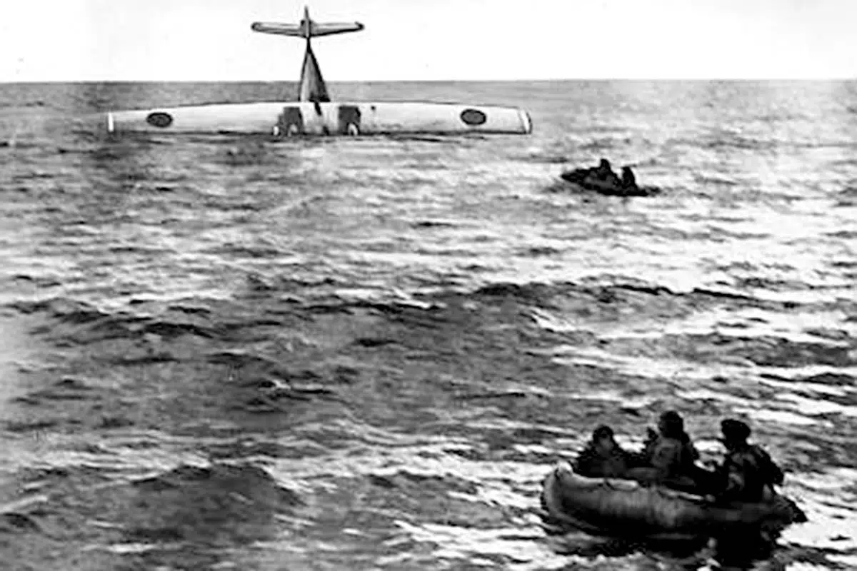 Bild: Den nedskjutna Catalinan strax efter nödlandningen. Bilden tagen från Münsterlands däck, Wikimedia, Public Domain.