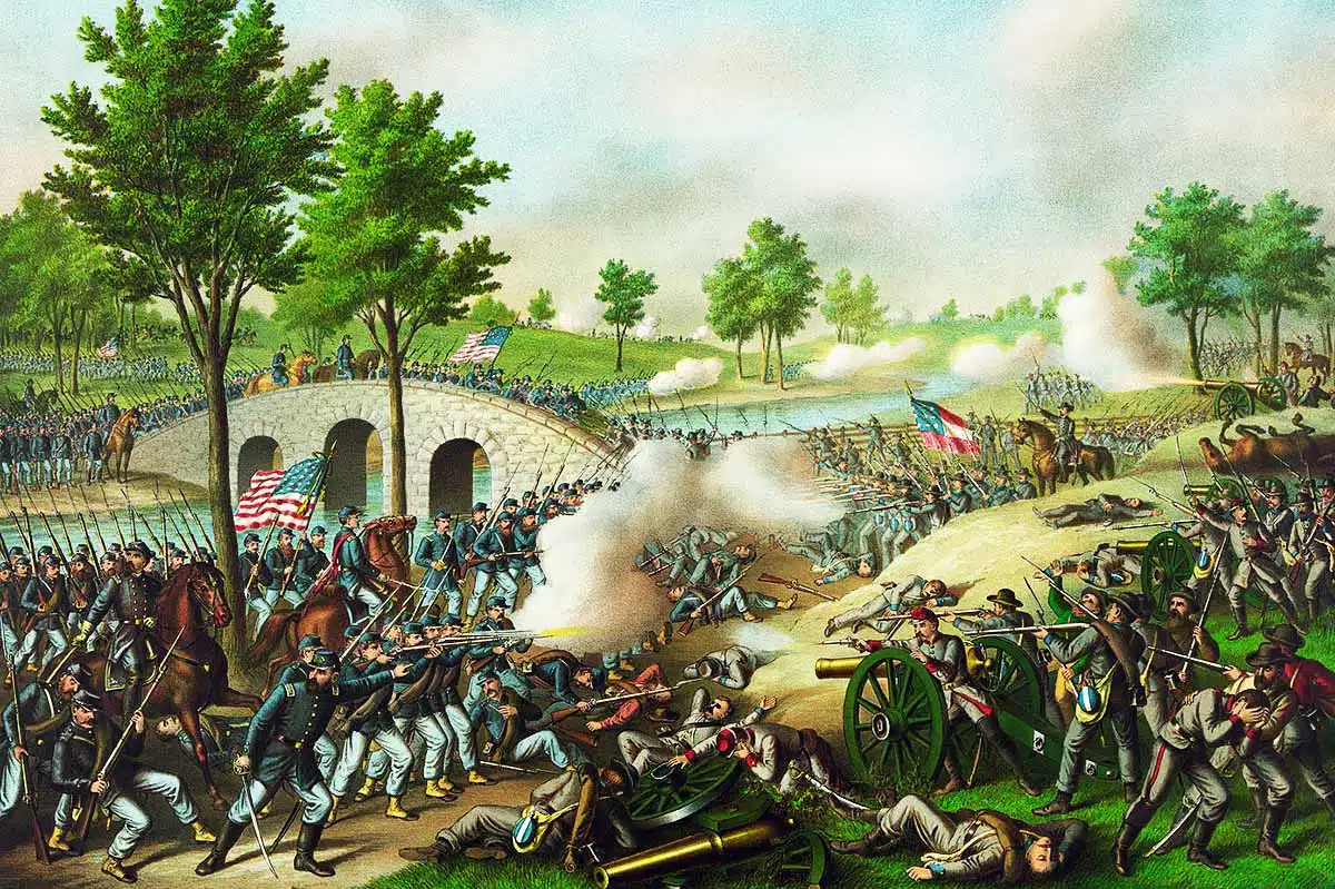 Bild: Bild: Slaget vid Antietam. Potomac-armén: Gen. Geo. B. McClellan, comm., Sept. 17′ 1862. – 1′ 2′ 4′ 6′ 9′ 12′ Corps & Pleasanton’s cav. div. engaged., Wikimedia Commons.