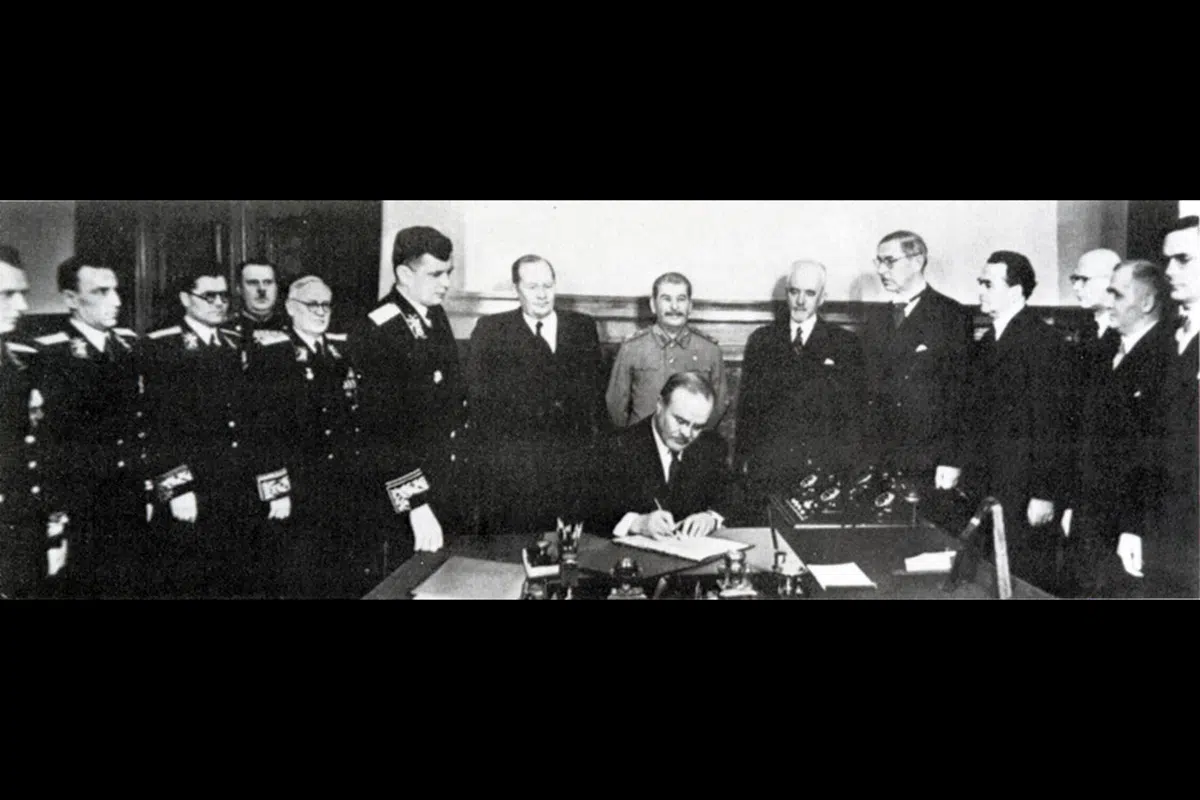 Bild: Undertecknande av VSB-pakten mellan Finland och Sovjetunionen i Moskva den 6 april 1948. Undertecknad av den sovjetiske utrikesministern Vyacheslav Molotov, följt av den sovjetiske statschefen Josef Stalin. Till vänster om Stalin står Finlands statsminister Mauno Pekkala, till höger om Stalin utrikesministrarna Carl Enckell och Reinhold Svento, inrikesminister Yrjö Leino och riksdagsledamöterna Urho Kekkonen, Onni Peltonen och JO Söderhjelm. Wikipedia. Public Domain.