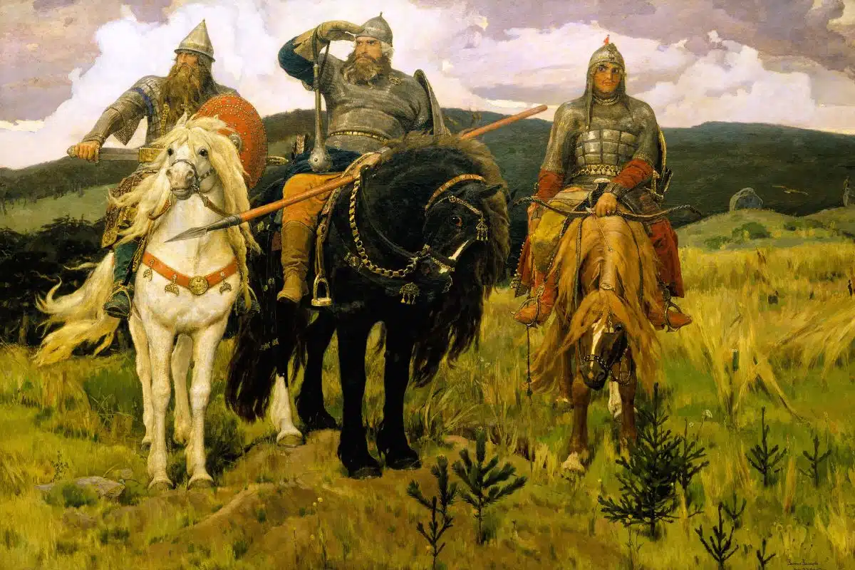 Bild: Bogatyrer av Viktor Vasnetotv från 1898, Wikipedia, Public Domain