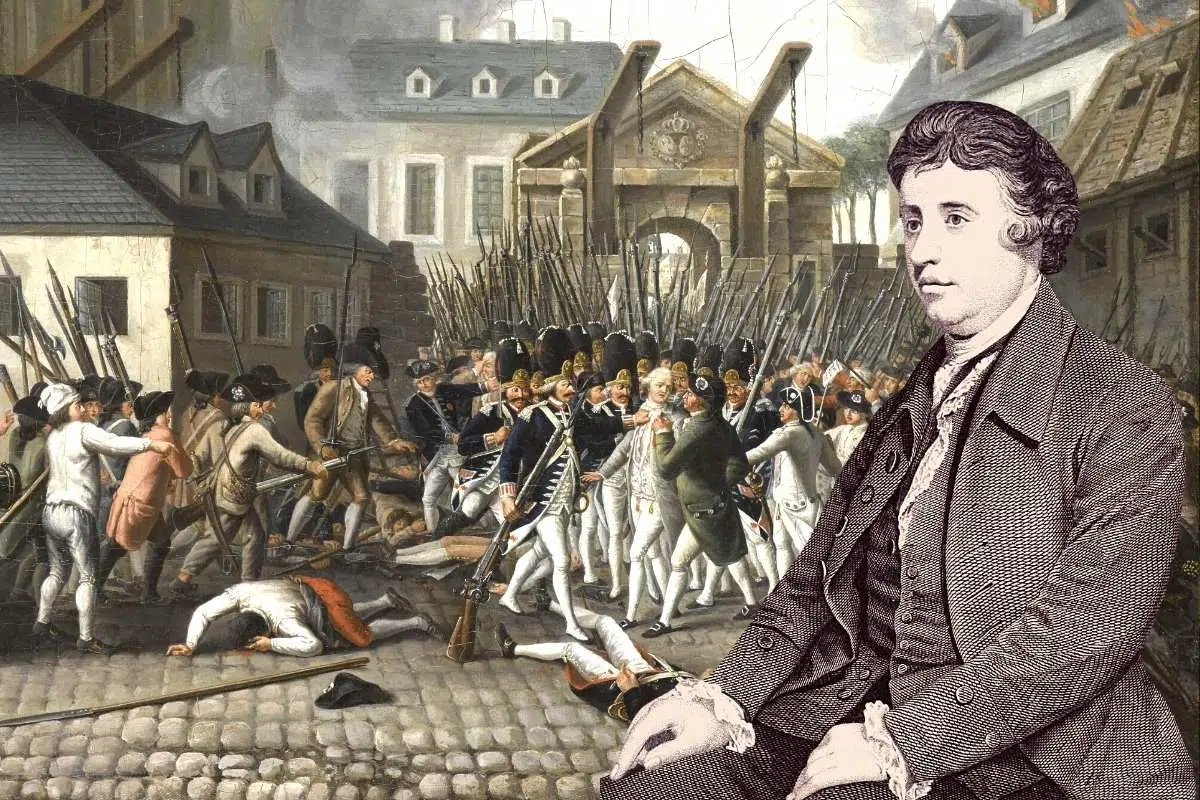 Bild: Montage av Stormningen av Bastiljen, 14 juli 1789 samt ett porträtt av Edmund Burke, upphovsmännen okända. Wikipedia, Public Domain.