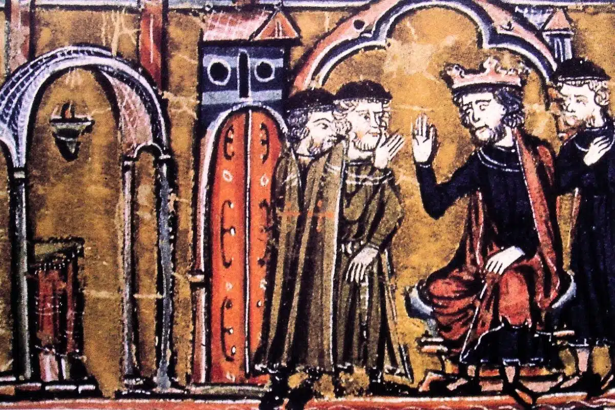 Bild: Baldwin ger Salomons tempel till Hugh av Payens och Godfrey av Saint-Omer, Guillaume de Tyr – ”Histoire d’Outre-Mer”, Guillaume de Tyr, 1200-talet, återgiven i Les Templiers, Patrick Huchet, Wikipedia, Public Domain.