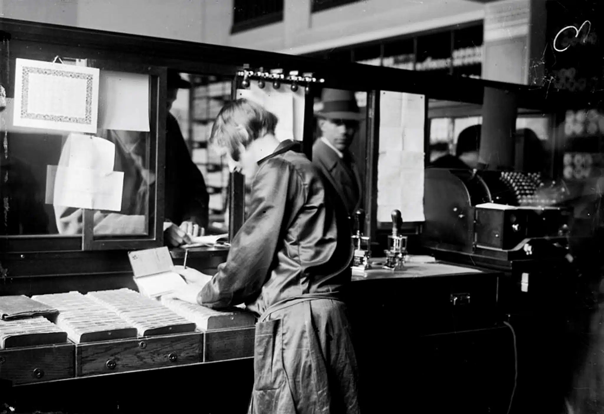 Bild: Kvinnlig expedit vid ett Stockholmssystem (nuvarande Systembolaget) stämplar och kontrollerar en motbok, Stockholms digitala stadsmuseum, Fotograf: Ransell, Karl, Svenska Dagbladet. Stockholms stadsmuseum, Mellan 1928 och 1934. Public Domain, Internet archive.
