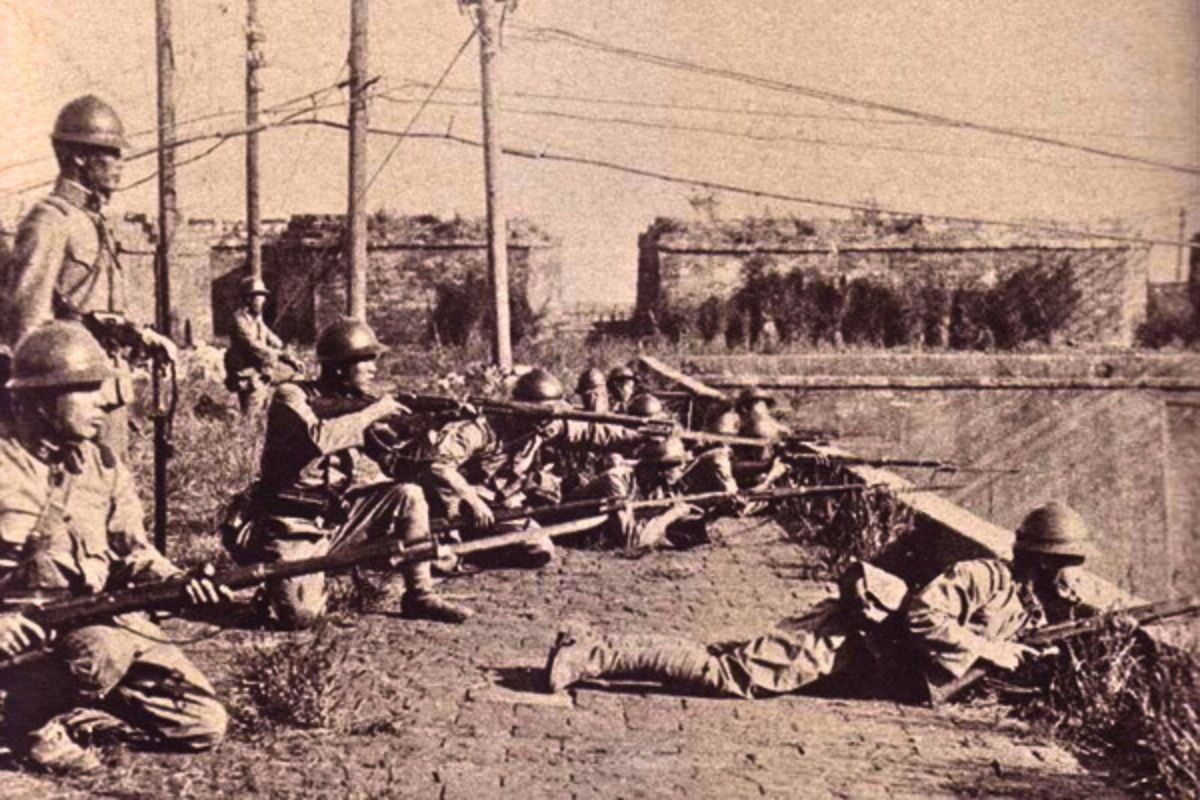 Bildtext: Japanska soldater ur 29:e regementet intar stridsställning vid Mukdens lilla västra port under Mukdenincidenten 1931 – en händelse som markerade början på Japans ockupation av Manchuriet. Källa: 勿忘历史:日本发动918事变东北沦丧(5) Fotograf: Okänd Licens: Public Domain.