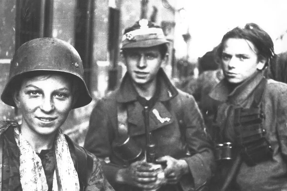 Bild: Scout-oldater från ”Radosław -regementet” efter flera timmars marschering genom avlopp från Krasińskitorget till Wareckagatan i Śródmieściedistriktet, tidig morgon den 2 september 1944. Pojken i hjälm är Tadeusz ”Maszynka” Rajszczak från Miotłabataljonen. Wikipedia, Public Domain