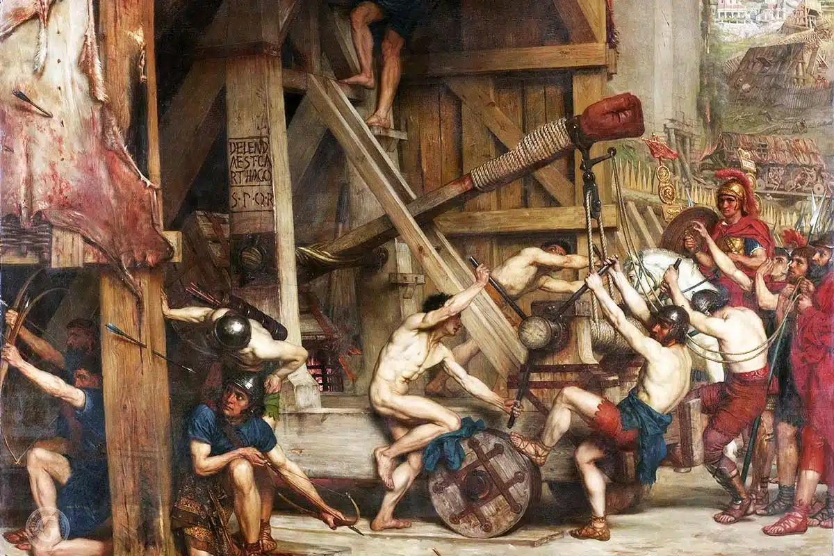 Bild: Romerska soldater som bemannar en katapult för en attack mot Karthagos murar, under belägringen som slutade i förstörelsen av Karthago 146 f.Kr. Cato den äldres berömda kommando, ”Delenda est Carthago” (citerad i Pultarchs ”Life of Cato”) är huggen i träet på den enorma katapulten. Av Edward Poynter 1868, Public Domain.