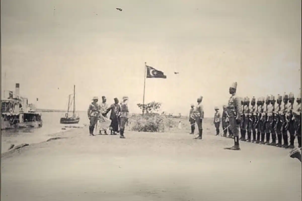 Bild: Ankomst av de anglo-egyptiska trupperna till Fashoda. Fotograf: Okänd, 1898 – Frederick A. Sharf, red., Expedition from Uganda to Abyssinia (1898), Newburyport Press, 2005. Fotografi som visar hur den egyptiska flaggan hissas vid Fashoda efter Kitcheners flottiljs ankomst 1898. Wikipedia, Public Domain.