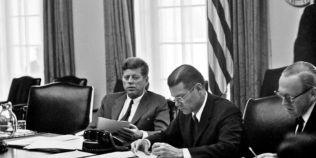 Bild: President John F. Kennedy i möte med medlemmar ur den nationella säkerhetsrådets exekutivkommitté (EXCOMM) under Kubakrisen. Från vänster: president Kennedy, försvarsminister Robert S. McNamara och biträdande försvarsminister Roswell Gilpatric. Fotot är taget i Cabinet Room, Vita huset, den 29 oktober 1962. Foto: Cecil Stoughton, White House Photographs. John F. Kennedy Presidential Library and Museum, Boston. Licens: Public Domain.