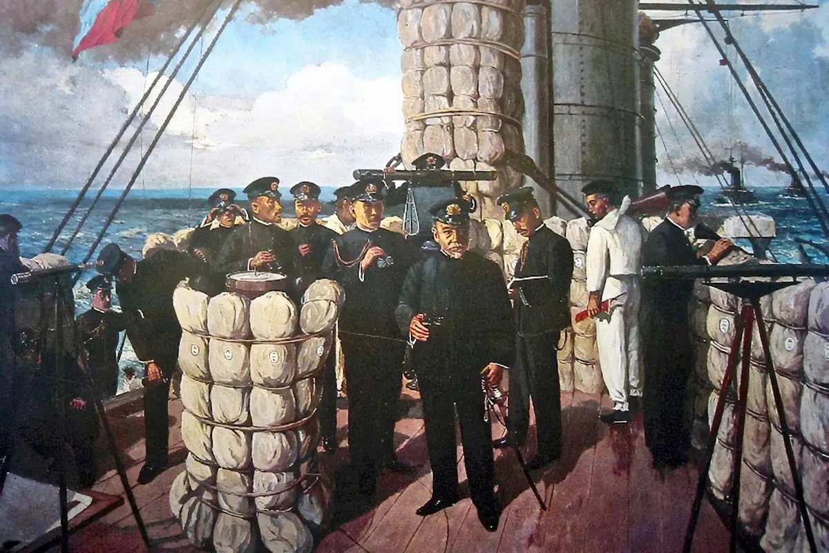 Bild: Målning av amiral Heihachirō Tōgō på däck till det japanska slagfartyget Mikasa, före slaget vid Tsushima 1905, Wikipedia, Public Domain.
