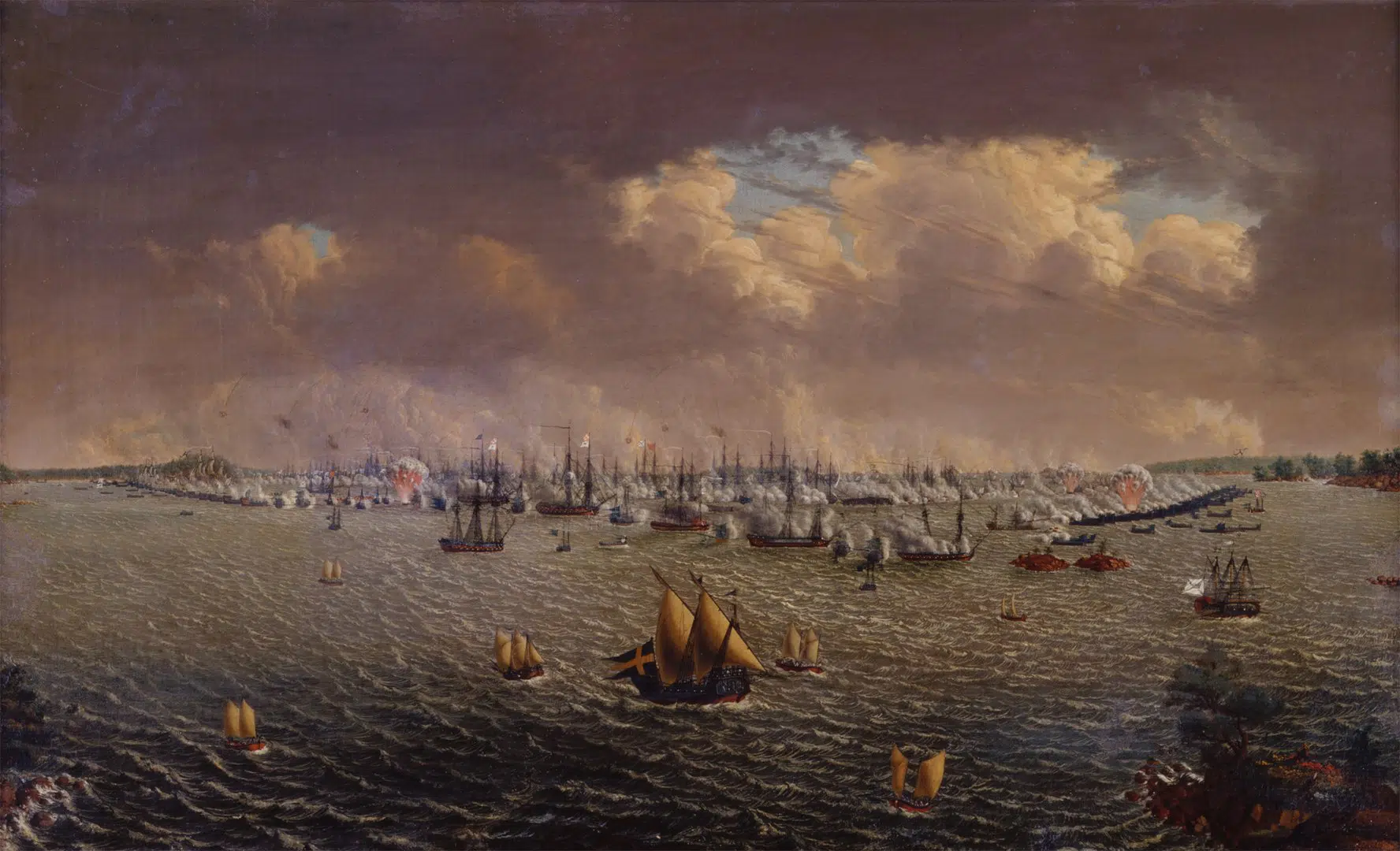 Bild: Slaget vid Svensksund den 9 och 10 juli 1790, då Svenska Skärgårdsflottan under Konungens eget befäl eröfrade 55 ryska fartyg av Johan Tietrich Schoultz.