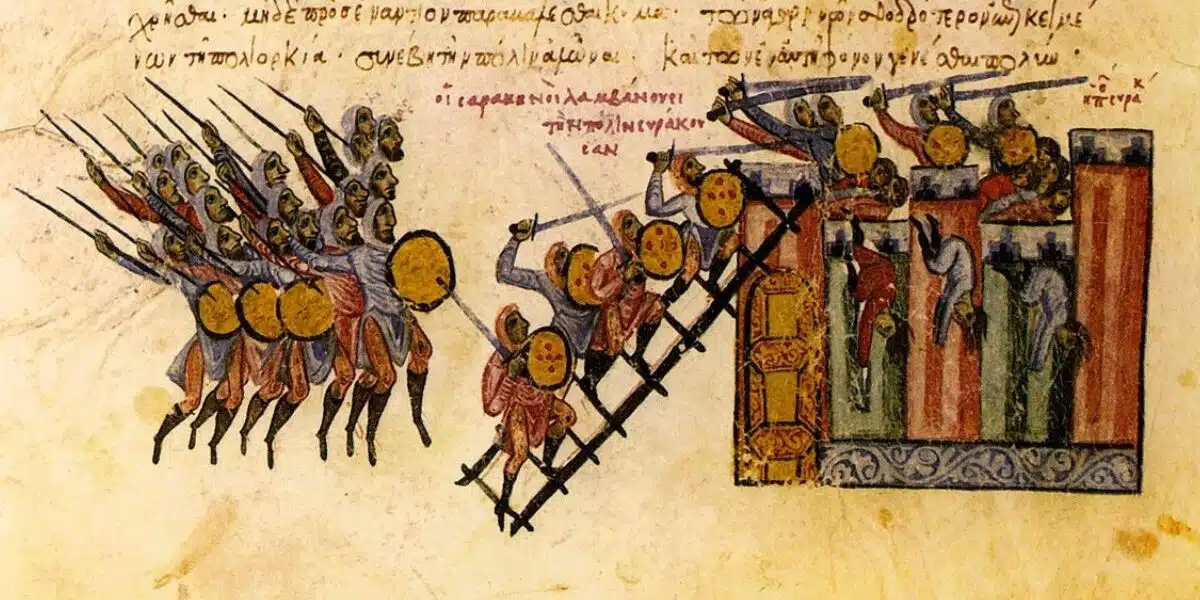 Bildtext: Miniatyren skildrar den arabiska erövringen av Syracuse år 878, ett centralt skeende i Medelhavets medeltida maktkamp. Ur Madrid Skylitzes, en bysantinsk krönika illustrerad på 1100-talet av okända konstnärer. Public domain via Wikimedia Commons.